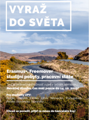 Písemné přihlášky na studijní/pracovní pobyty lze podat do 14. 10. 2019 (12.00 hodin) referentce pro vnější vztahy Mgr. Janě Býmové (U18/615).