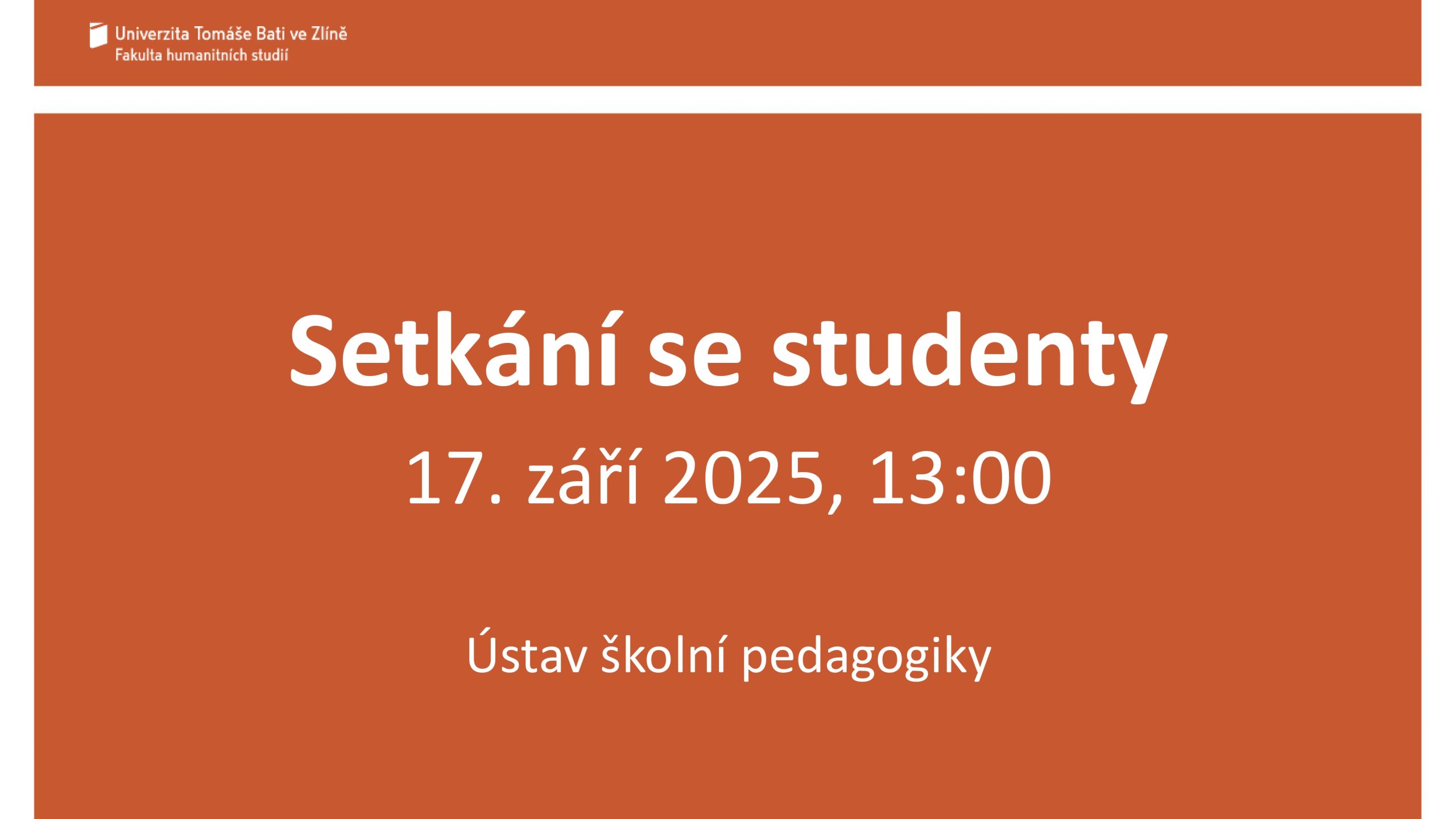 23. září 2025Na ústavě školní pedagogiky proběhlo úvodní setkání se studenty, kde byly prezentovány základní informace ohledně studia v akademickém roce 2025/2026.