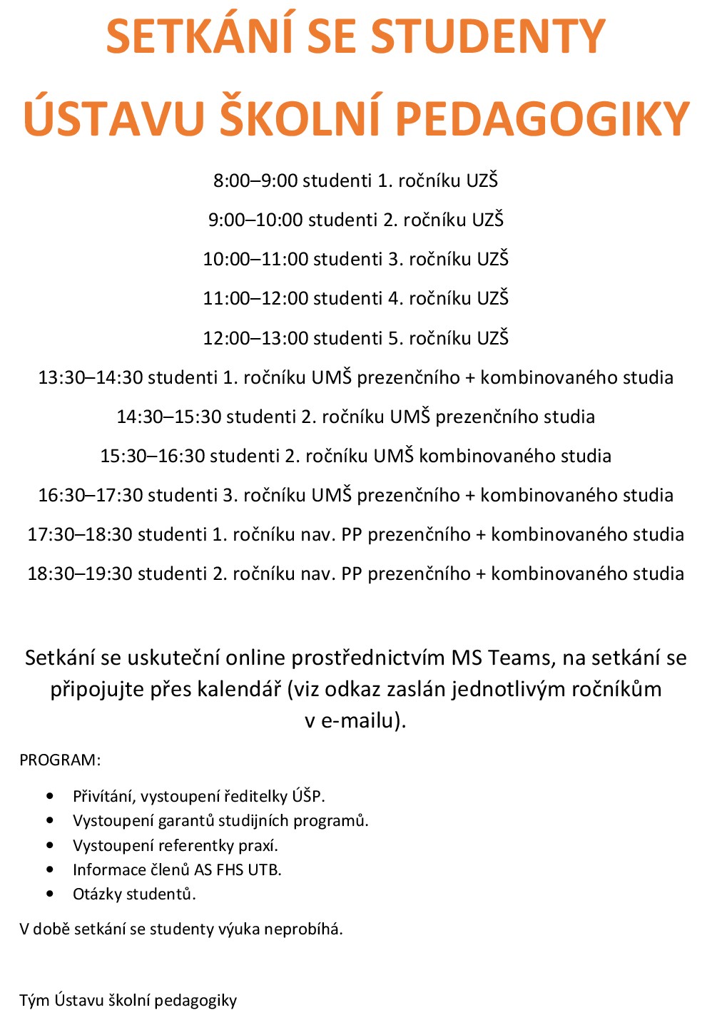 Ústav školní pedagogiky zve všechny své studenty na SETKÁNÍ SE STUDENTY ÚŠP, které se uskuteční ve čtvrtek 10. 2. 2022 podle zveřejněného harmonogramu.