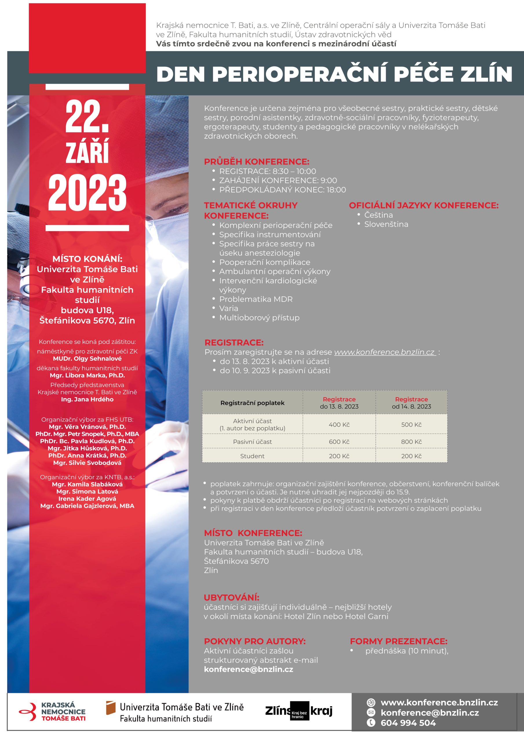 Krajská nemocnice T. Bati, a.s. ve Zlíně, Centrální operační sály a Univerzita Tomáše Bati ve Zlíně, Fakulta humanitních studií, Ústav zdravotnických věd Vás tímto srdečně zvou na konferenci s mezinárodní účastí.