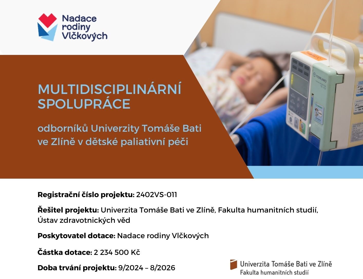 Hlavním cílem projektu je prohloubit znalosti akademických pracovníků a následně studentů v oblasti dětské paliativní péče. Dále pak implementovat a zdůraznit význam problematiky dětské paliativní péče v rámci výuky paliativní péče v 10 předmětech studijních programů Ústavu zdravotnických věd a Ústavu pedagogických věd Fakulty humanitních studií UTB ve Zlíně. Bude vytvořen také nový povinně volitelného předmětu s vybranou problematikou dětské paliativní péče vzhledem k zapojeným studijním programům.